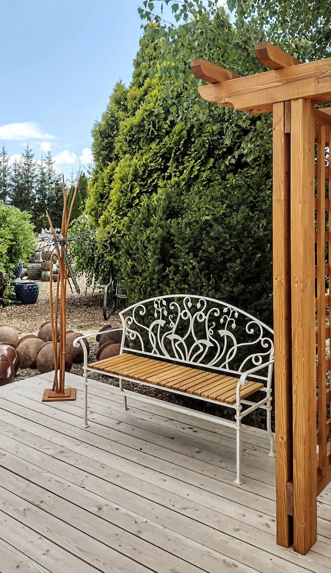Lavička vhodná do záhrady aj do domu s ručne kovaným vzorom, drevo - dubový masív.